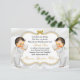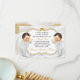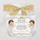 Beaux garçons jumeaux en costume blanc et en croix d'or bible. arrière - plan d'invitation est le satin blanc avec un cadre de parties scintillant or et argent et l'embellissement de l'arc. Le dos est orné de motif de fleurs dorées et de ruban doré sur un arrière - plan de satin blanc.