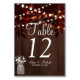 Rustic wedding table number with editable text featuring rustic twinkle lights, mason jar with white flowers and rust autumn leaves on dark brown barn wood background. Ideal for your night autumn fall | elegant rustic country | outdoor backyard themed wedding.