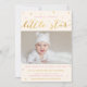 Twinkle twinkle little star first birthday party invitations for a girl, with a custom photo of baby and pink and gold stars against a simple sophisticated cream background. "Twinkle, twinkle little star, one year old is what you are!" is in gold and pink, with first birthday party details below. You can the cards as first birthday announcements as well.