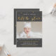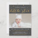 Twinkle twinkle little star first birthday party invitations for a boy or girl, with a custom photo of baby and white and gold stars against a chalkboard grey coloured background. "Twinkle, twinkle little star, one year old is what you are!" is in gold and white, with first birthday party details below. You can the cards as first birthday announcements as well.