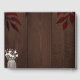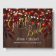 Élégant script de calligraphie or livre d'invité avec des lumières scintillantes rustiques, pot de maçon avec fleurs blanches (à l'arrière) et feuilles d'automne rouille sur arrière - plan de grange brun foncé. Idéal pour votre automne de nuit | pays rustique élégant | mariage à thème jardin extérieur.