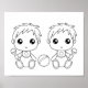 Cute cartoon baby boys in jumpsuits with matching star bibs holding baby rattles. Toy ball is resting between them. Made for easy colouring.