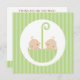 Stylish baby shower invitations featuring an adorable illustration of two babies inside an umbrella on a stripes background. Perfect design for your twins baby shower. Art © Cocoa Studio