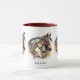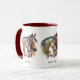 A mug with an image featuring a pair of horses. Wearing decorative headbands. Surrounded by feathers and foliage.