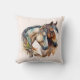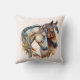 A pillow with an image featuring a pair of horses. Wearing decorative headbands. Surrounded by feathers and foliage.