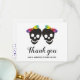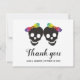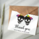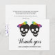 Two skull brides and confetti in rainbow colours Halloween lesbian wedding Thank You note card. This wedding design features the skulls of two brides with bows in rainbow colours while the back includes a pattern of colourful confetti to the botttom part.