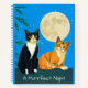 Journal in an illustration of a black and white tuxedo cat and an orange tabby, sit under a starry sky with a full moon. Surrounded by silhouetted greenery, they create a serene nighttime scene. The playful text “A Purrfect Night” adds whimsy to the illustration.