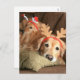 This postcard features a pair of golden retriever dogs resting on a couch and sporting Christmas holiday headbands.