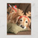 This postcard features a pair of golden retriever dogs resting on a couch and sporting Christmas holiday headbands.