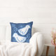 This wintry throw pillow has an illustration of two white doves surrounded by light blue snowflakes on a dark blue background. The reverse side of this square pillow is adorned with a pattern of snowflakes and ice crystals.