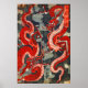 TWO DRAGONS JAPANESE WOODCUT IN RED BLACK WHITE POSTER