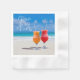 Two drinks paper napkins with text template at the top.  Frosty cocktails sit on a sunny beach with tropical ocean water in the background.  White text across the top can say anything, or delete it to order the napkins blank.  Many sizes and options.