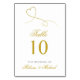 NewParkLane - Elegant personalized wedding tabel number cards, with two faux gold swirly hearts, against a white background. With 'Table' and the names of the bride and groom in elegant script typography in gold.