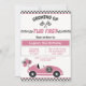 Cute "Growing up Two Fast" 2nd birthday race car invitation in pink and grey. Customize invitation with your child's name, date, time and location of party.