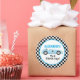 A cute retro style blue race car with customized text. The outer circle is a racing pattern. The number in the middle of the car can be customized, as well as all of the wording.