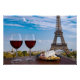 Two glasses of red wine with snacks with view of Paris and Eiffel tower. Glass of red wine with different snacks - plate with ham, sliced, blue cheese. Couple, romantic celebration. Cafe with view