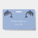 This name or identification badge is light blue with two glittery dolphins in dark blue and white in a jumping position on the front and one larger dolphin on the back. Customize your name and information with the templates.