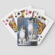 Playing Cards in two cats sitting gracefully against a deep blue, abstract background. The realistic fur textures with bold linework and geometric elements, creates a modern, surreal atmosphere. Their expressive yellow eyes contrast strikingly with the cool-toned surroundings.