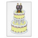 Two cartoon grooms and a cat standing on top of a multi tiered wedding cake.