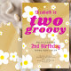This cute "Two Groovy" tan and white retro daisies 2nd birthday invitation with personalizable text is perfect for a girl's second birthday party. It features hand-drawn flowers on a tan ombre watercolor background, and text that you can customize with your own details. The invitation template is customizable in the listing editor and is also available as a digital download that's printable after you personalize it.