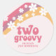Retro inspired two groovy second birthday invitation sticker with 70's style daisies and boho fonts and colours.