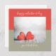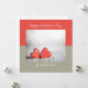 Modern artistic valentine features red / grey colorblock background with centre pic of two red wood hearts and bokeh background,  happy valentine's day in white modern script with customizable script at bottom to add your own personal touch.