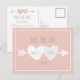 A sweet Two Hearts save the date postcard with a dusty pink background designed with love by Aubergine and Purple. Perfect of a romantic wedding. Bride and Groom names along with date are customizable.