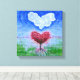 An acrylic painting with 2 hearts, one made of a cloud, another of red leaves, rooted in the ground. Open to your interpretation. Ordinal painting done in acrylic paint.