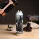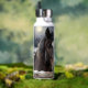 A personalized water bottle with an illustration of two horses on a snowy winter ranch with a full moon in back of them standing behind an old rustic fence.