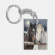 A key chain with an illustration of two horses on a snowy winter ranch with a full moon in back of them standing behind an old rustic fence.