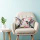 Two hummingbirds in flight with pretty pink hibiscus flowers and trumpet flowers on a lumbar pillow for all your spring home decor ideas.