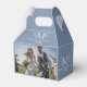 Wedding favour box design with two photos of newlyweds, blue-grey background colour with customizable white botanical flowers embellishments monogram—personalizable names and date.