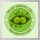 Snuggled together inside a green pod are two adorable peas. Each pea has dots for eyes and a happy cheeky smile. Surrounding the pod are vines and green leaves. The design is set inside a green circle. Around the edge top and bottom are the words "we go together like two peas in a pod" in green lettering.
