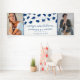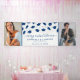 Modern joint graduation party banner featuring a simple white background that can be changed to any colour, 2 photos of the graduates, falling blue mortarboard caps, and a modern text template that is easy to personalize.