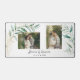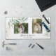 Commemorate your special event on your custom desk mat featuring template for two photos...one horizontal and one vertical with simple elegant eucalyptus leaves with sparkly gold highlights and text fields.
