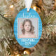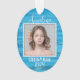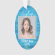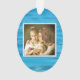 Oval Christmas ornament for a daughter. Blue water background with square photo template on the front, with her name in elegant script. "Christmas" and the year date is printed beneath the picture, with one more photo template on the back. Makes a beautiful holiday gift and keepsake for the family.