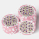"Two poker chips with pink borders and intricate floral patterns featuring purple and pink flowers on a beige background, shown from front and back."