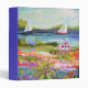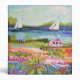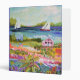 Two Sailboats and Cottage I by Karen Fields. Bright, fun scene with flowers, trees, a cottage, and sailboats out on the water.