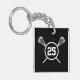 Custom lacrosse number keychain. Black and white, personalized lacrosse player number keychain. White design on black background on one side, reverse black design on white background on the other side. Circle and crossed lacrosse sticks frame with your individualized player number inside.