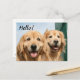 This postcard features a photograph of two happy, smiling golden retriever dogs outside. Text on the front reads, "Hello!" while the text on back states, "Just wanted to say hi!" Both can be changed or deleted to suit your needs.