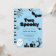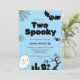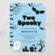 Halloween birthday party invitation card with pictures of a ghost, spider, bat, and candles. The title is two spooky."