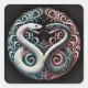 Two stylized snakes, one white and one black, intertwining in a circular composition. The snakes should have fierce expressions and be surrounded by ornate floral designs in soft blue and pink hues. The background should be dark, enhancing the vivid colours and giving a cosmic feel, reflecting themes of duality and balance.