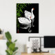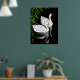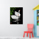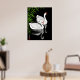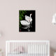 Poster in a vintage Japanese illustration on two swans swimming and reflected jn a pool, In a dramatic white on black composition