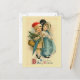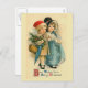 Designed by Susan Epps Oliver. Delightful vintage Christmas image of two little children. The little girl wears a light blue dress, a white shawl and a black hat trimmed with flowers. Her escort carries a blue folded umbrella, a wicker basket and some holly. The message is "Best Wishes for a Merry Christmas".