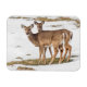 Two deer give the photographer a close look from their grassy place in a spring thawing field.