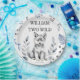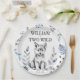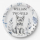Two Wild wolf themed birthday party tableware personalized party plates, cute fluffy grey wolf cub some forest leaves for a wolf woodlands birthday party