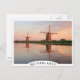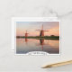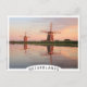 Photo postcard of two windmills along a river with reflection in the still water in the sunset light on a summer evening in the Netherlands with a white edge and the curved text 'Netherlands'.