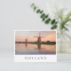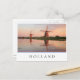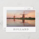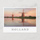 Photo postcard of two windmills along a river with reflection in the still water in the sunset light on a summer evening in the Netherlands with a white edge and the text 'Holland' and stripes in red, white and blue, the colours of the dutch flag.