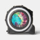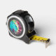 A Silver Tape Measure, With a Picture, of a Tye Dye design=( Tye Dye #1), = (Turquoise,Yellow,Dark Purple,Red), on it.
