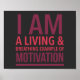 Typography that says I am a living & breathing example of motivation. Motivational poster with black background.